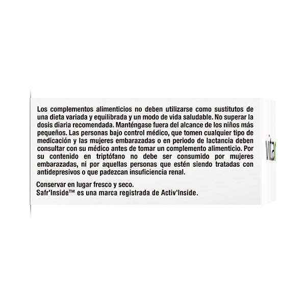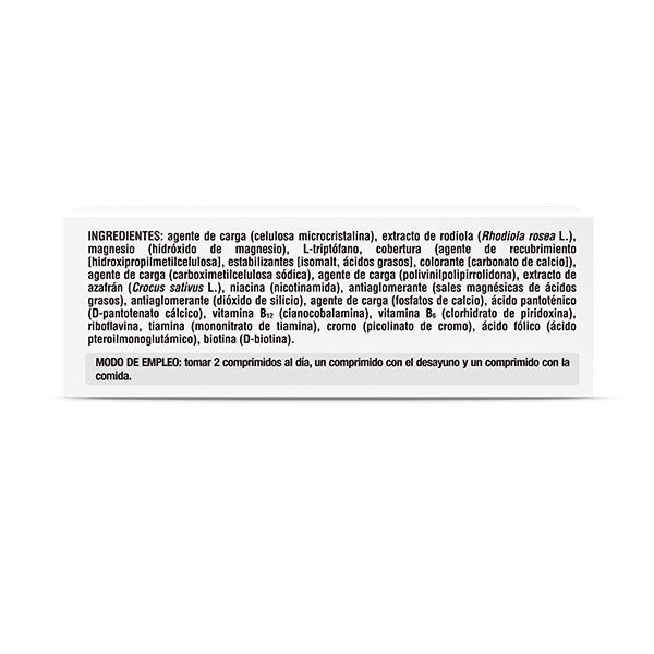 Agente de carga (celulosa microcristalina), extracto de rodiola (Rhodiola rosea L.), magnesio (hidróxido de magnesio), L-triptófano, cobertura (agente de recubrimiento (hidroxipropilmetilcelulosa), estabilizantes (isomalt, ácidos grasos), colorante (carbonato de calcio), agente de carga (carboximetilcelulosa sódica), agente de carga (polivinilpolipirrolidona), extracto de azafrán (Crocus sativus L.), niacina (nicotinamida), antiaglomerante (sales magnésicas de ácidos grasos), antiaglomerante (dióxido de silicio), agente de carga (fosfatos de calcio), ácido pantotécnico (D-pantotenato cálcico), vitamina B12 (cianocobalamina), vitamina B5 ( Clorhidrato de piridoxina), riboflavina, tiamina (mononitrato de tiamina), cromo (picolinato de cromo), ácido fólico (ácido pteroilmonoglutámico), biotina (D-biotina).