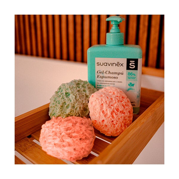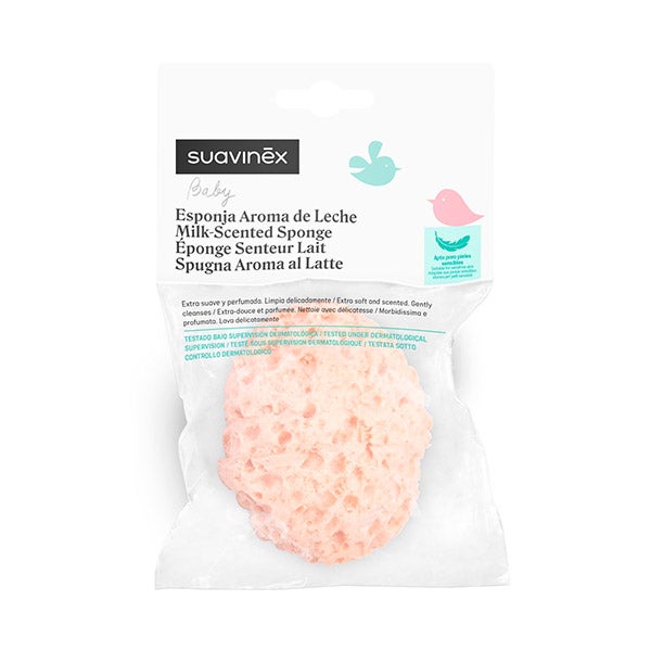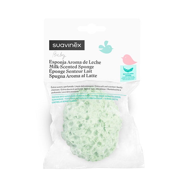 Esponja para bebês +0 meses com aroma de leite, extra suave e perfumada. Limpa delicadamente a pele do bebê.