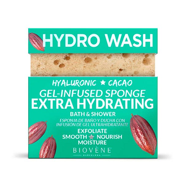 Esponja de banho e ducha multifuncional ultrahidratante infundida com ácido hialurônico intensamente hidratante, cacau e óleo de semente de uva que nutre, esfolia e suaviza a pele instantaneamente.