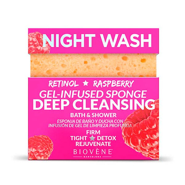 Esponja de banho e ducha multifuncional para limpeza profunda infundida com retinol extra reafirmante, framboesa e óleo de coco que aperta, hidrata e elimina instantaneamente a sujeira da pele.