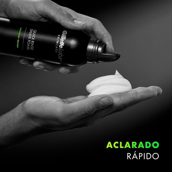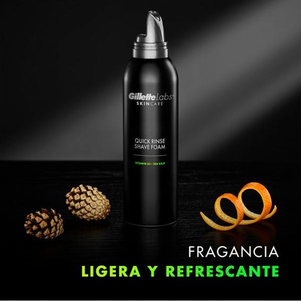 A espuma de barbear GilletteLabs de rápido enxágue possui uma formulação leve que facilita seu enxágue.