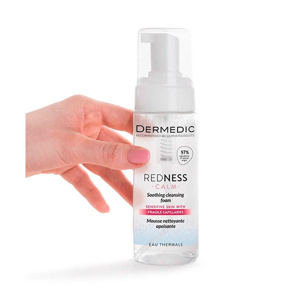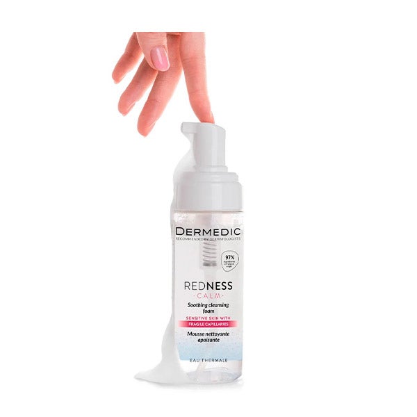 REDNESS Espuma de Limpeza Calmante é especialmente projetada para peles sensíveis, propensas a couperose, telangiectasias, eritema ou rosácea.