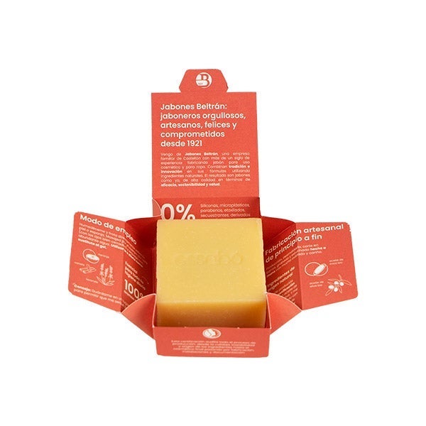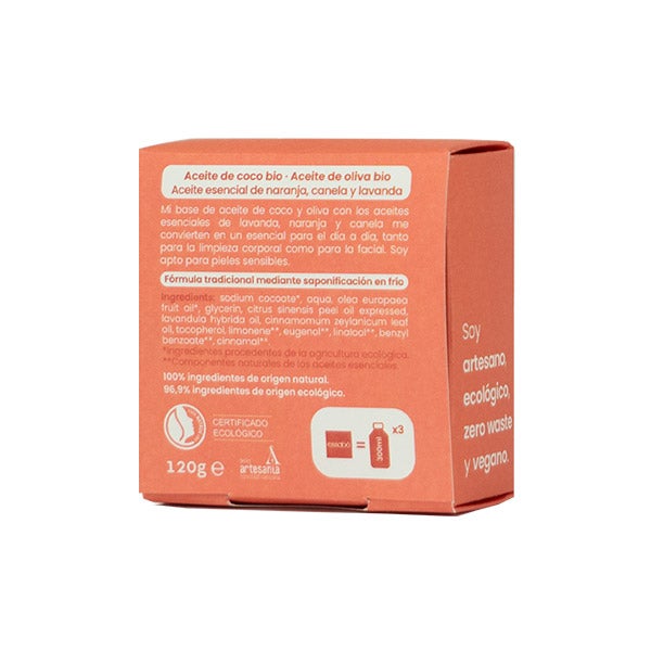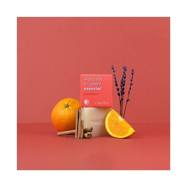Essabó Essencial é um sabonete cosmético de banho tudo em um: corpo, rosto e mãos, aromatizado com óleos essenciais de lavanda, canela e laranja. Sua base é elaborada com óleo de coco de agricultura sustentável e óleo de oliva proveniente de cultivos orgânicos espanhóis. Elaborado artesanalmente por meio de saponificação tradicional a frio. Ideal para todos os tipos de pele, incluindo as delicadas e/ou sensíveis.