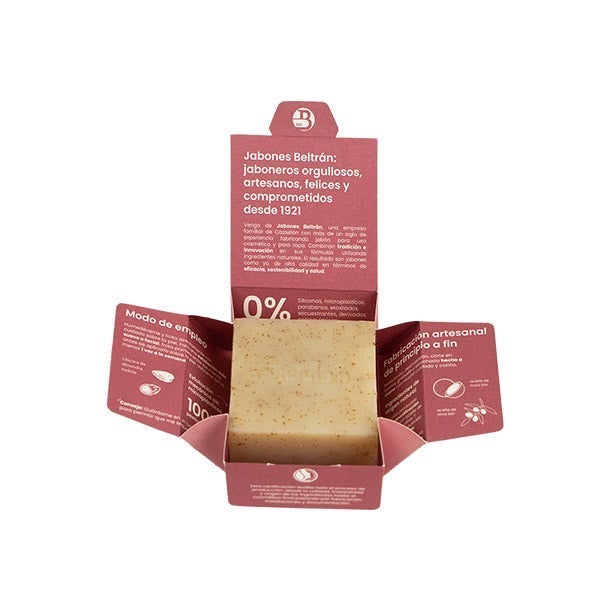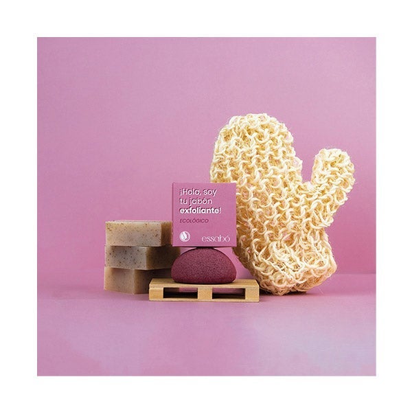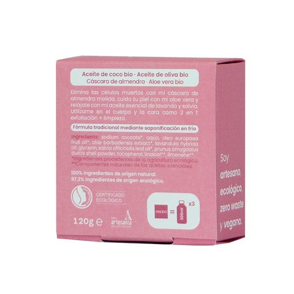 Essabó Exfoliante é um sabão de banho formulado para esfoliar naturalmente a pele, graças à casca de amêndoa moída e ao aloe vera orgânico. Sua base é elaborada com óleo de coco e com óleo de oliva ecológicos. Elaborado artesanalmente por meio de saponificação tradicional a frio. Ideal para todos os tipos de pele.