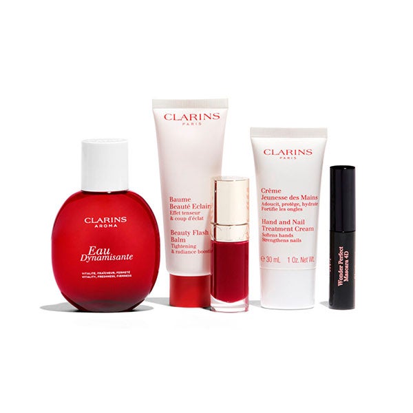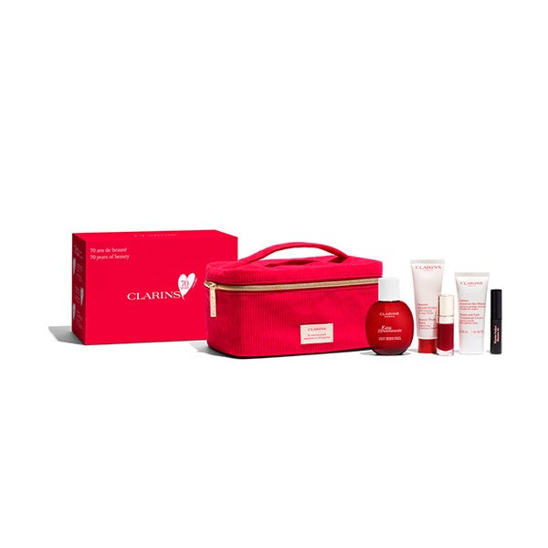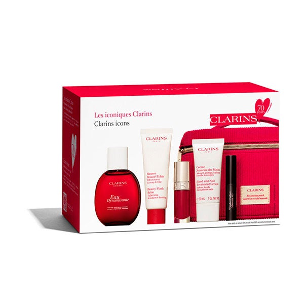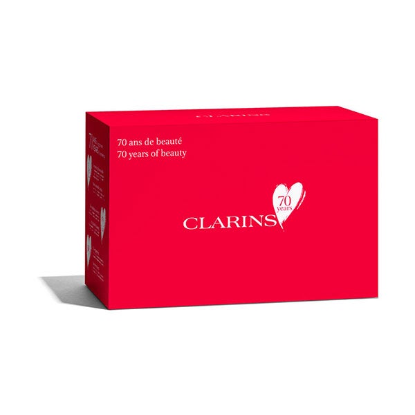 Cofre para celebrar os 70 anos de Clarins. É composto por Eau Dynamisante, uma água de tratamento com um perfume revigorante que cuida da pele e da mente, Beauty Flash Bam que devolve a luminosidade à pele, atenua os sinais de cansaço, ao mesmo tempo que firma visivelmente os traços.