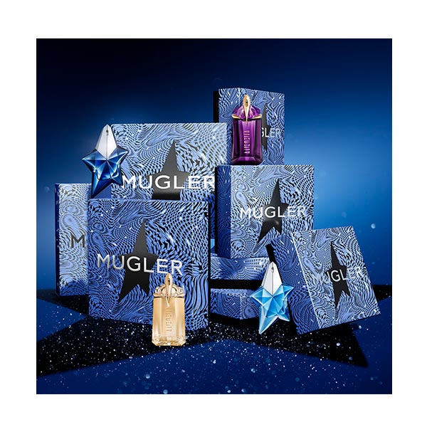 Esta temporada natalina, sob a luz das estrelas de Mugler, sua realidade se transforma em um cenário de fantasia. Mergulhe em um espetáculo estelar psicodélico com este cofre de presente com uma ousada estampa de estrelas, projetado em colaboração com a moda Mugler.