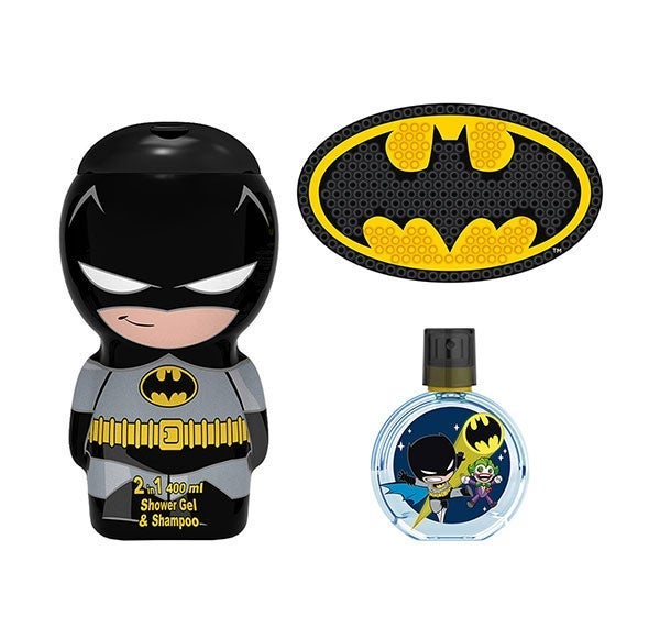 O estojo de Batman e Joker contém uma fragrância frutal e floral em formato 50 ml, gel de banho e shampoo 2 em 1 400 ml e um fidget toy para brincar onde quiser.