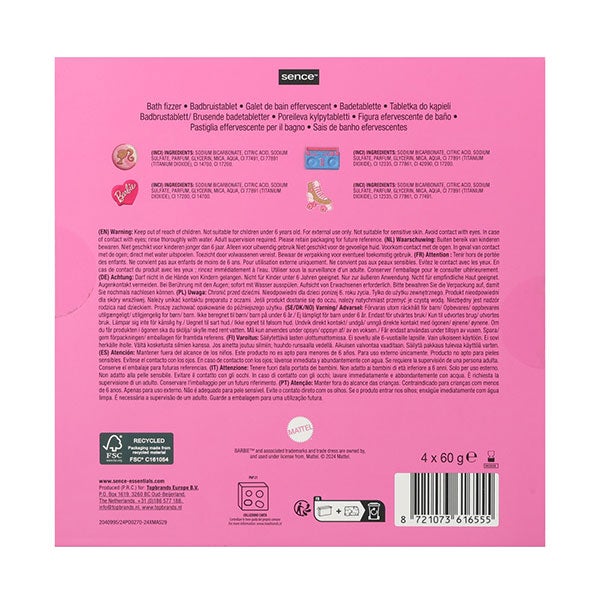 Entre no alegre espírito natalino do mundo Barbie com o Conjunto de Presente Sence Barbie Bath Fizzer. Esses efervescentes fazem sua mágica, transformando seu banho em um relaxante e radiante país das maravilhas rosa. Mimam sua pele e envolvem você em um aroma de sonho de frutas de inverno e celebração festiva.