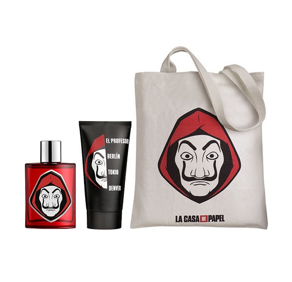 La Casa de Papel apresenta após seu novo golpe este estojo com uma fragrância 100 ml com notas cítricas e aromáticas, gel de banho 100 ml e uma tote bag com a icônica máscara de Dalí.