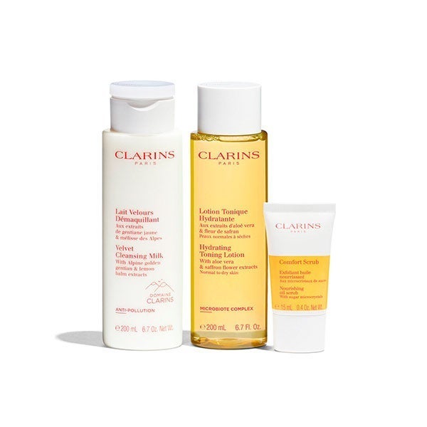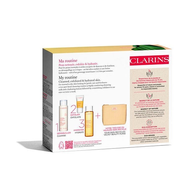 Set Clarins Limpieza Piel Normal. Cofre Limpieza Pieles Normales : Leche desmaquillante 200 ml + Locion Tonica Hidratante 200 ml + crema exfoliante confort 15 ml