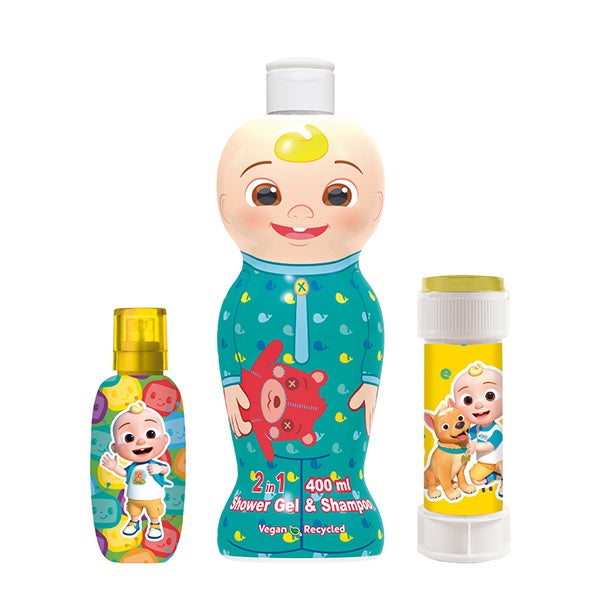 O novo estojo presente de CoComelon inclui uma fragrância em formato 50 ml com notas cítricas e florais, um gel de banho e shampoo 2 em 1 de JJ para uma higiene completa e divertida, e um soprador de bolhas para brincar enquanto canta suas músicas.