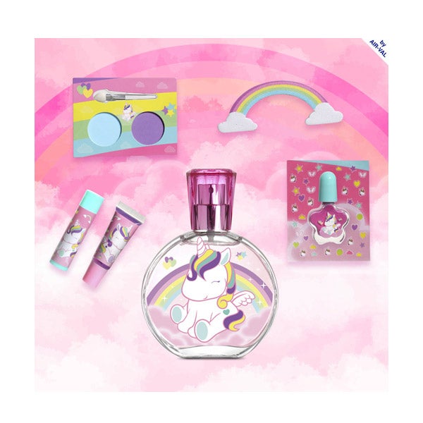 O novo estojo de Eau my Unicorn vem acompanhado de tudo o que você precisa para uma maravilhosa aventura. Uma fragrância em formato de 50 ml com acordes frutais e florais, com duas sombras de olhos, brilho labial, esmalte e uma lixa em forma de arco-íris.