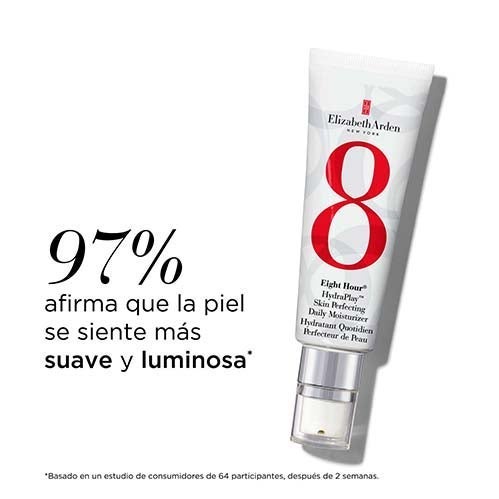 Eight Hour Hydraplay Skin Perfecting Daily Moisturizer 45ml: Um fluido hidratante de uso diário com uma textura ultraleve que proporciona um impulso de hidratação imediato, aumentando a umidade da pele em 64%*. Sua fórmula avançada ajuda a suavizar a textura da pele, minimizar a aparência dos poros e controlar o excesso de brilho, alcançando uma tez mais uniforme, fresca e fortalecida. Seu acabamento leve e não comedogênico o torna ideal para qualquer tipo de pele.