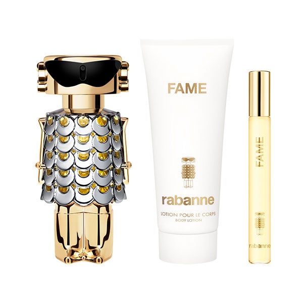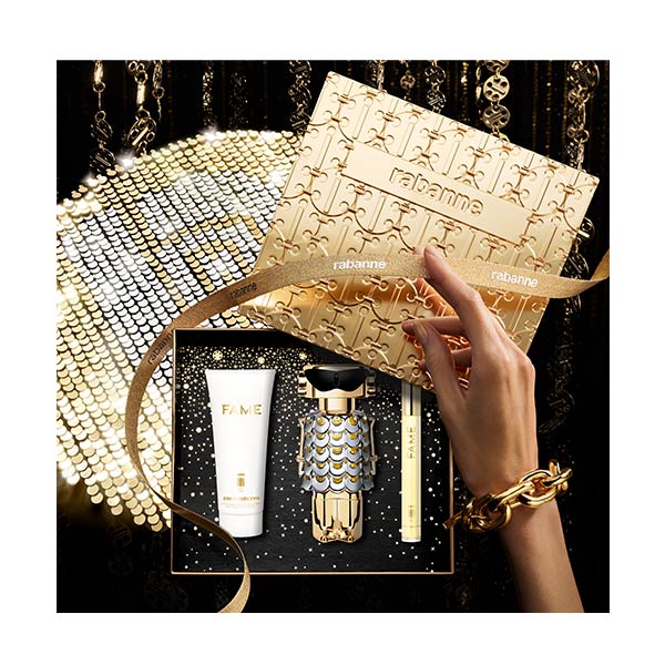 Entre em um mundo resplandecente com este deslumbrante estojo metálico inspirado no design icônico da Maison Rabanne. Descubra a fragrância Fame Eau de Parfum vaporizador de 80 ml, sua loção corporal de 100ml e seu formato de viagem de 10ml para festas absolutamente radiantes.
