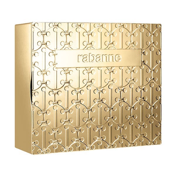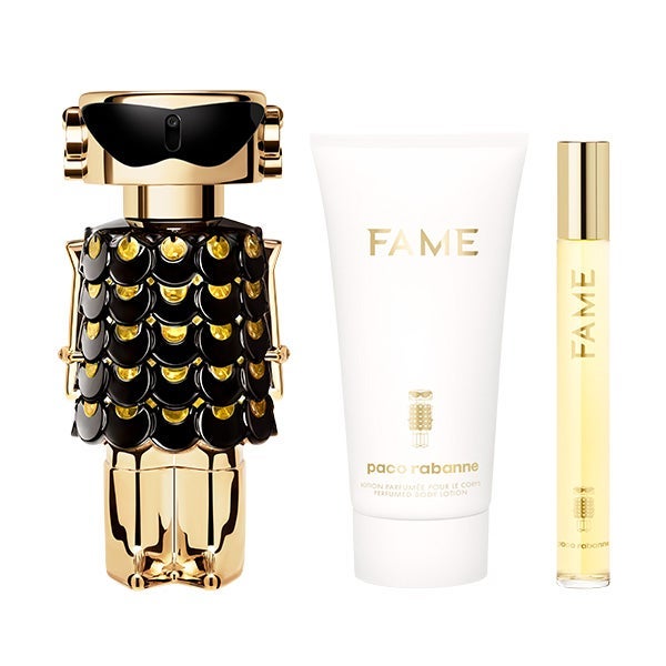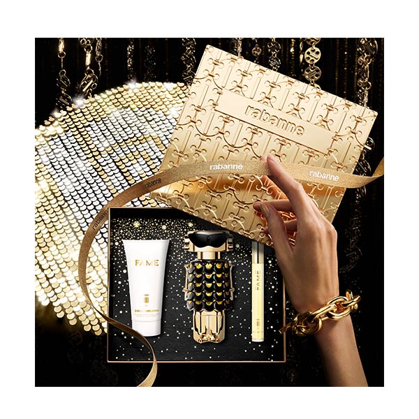 Entre em um mundo resplandecente com este deslumbrante estojo metálico inspirado no design icônico da Maison Rabanne. Descubra a fragrância Fame Parfum vaporizador de 80 ml, sua loção corporal de 75 ml e seu formato de viagem de 10ml para festas absolutamente radiantes.
