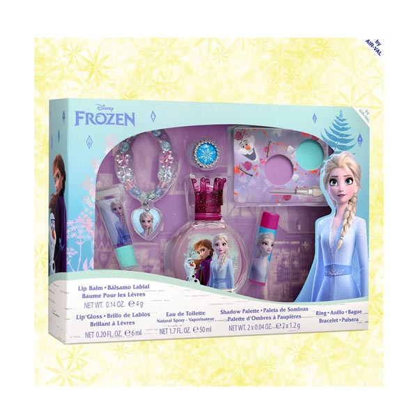 O estojo de Frozen inclui uma fragrância frutada em formato de 50 ml, um kit de maquiagem com sombras de olhos e batons, pulseira e anel.