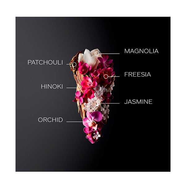 La elegancia natural de las flores se une con la potencia de las maderas sagradas para crear una mezcla perfectamente equilibrada. En el corazón del ramo, el jazmín, cuyo nombre significa “gracia” en japonés, destila sus facetas más bellas. Los pétalos de magnolia y de orquídea japonesa revolotean en un alegre torbellino, potenciado por la madera de Hinoki. A la vez fuerte y delicado, el aroma de este ciprés japonés sagrado evoca la intensidad del pachuli y la profundidad del sándalo.