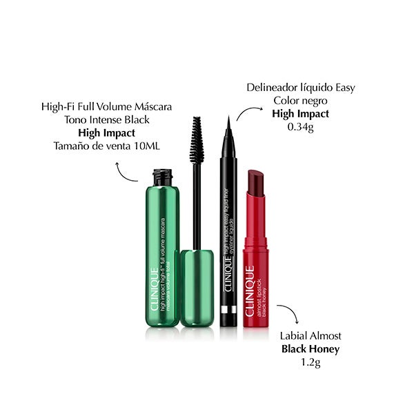 Ingredients: Ricinus Communis (castor) Seed Oil, Glyceryl Triacetyl Ricinoleate, Cetyl Ricinoleate, Euphorbia Cerifera (candelilla) Wax Candelilla Cera Cire De Candelilla, Copernicia Cerifera (carnauba) Wax Cera Carnauba Cire De Carnauba, Polyethylene, Tocopheryl Acetate, Pentaerythrityl Tetra-di-t-butyl Hydroxyhydrocinnamate, Barium Sulfate, [+/- Yellow 5 Lake (ci 19140), Blue 1 Lake (ci 42090), Iron Oxides (ci 77491, Ci 77492, Ci 77499), Red 7 Lake (ci 15850), Mica, Carmine (ci 75470), Titanium Dioxide (ci 77891), Red 6 (ci 15850), Red 22 Lake (ci 45380), Red 30 Lake (ci 73360), Yellow 6 Lake (ci 15985), Bismuth Oxychloride (ci 77163), Red 33 Lake (ci 17200), Red 28 Lake (ci 45410)] <ILN38083>. High Impact High-Fi™ Full Volume Máscara: Ingredients: Water Aqua Eau, Acrylates/ethylhexyl Acrylate Copolymer, Stearic Acid, Glyceryl Stearate, Synthetic Beeswax, Paraffin, Polyisobutene, Copernicia Cerifera (carnauba) Wax Copernicia Cerifera Cera Cire De Carnauba, Vp/eicosene Copolymer, Tromethamine, Cocos Nucifera (coconut) Oil, Argania Spinosa Kernel Oil, Moringa Oleifera Seed Oil, Ricinus Communis (castor) Seed Oil, Caprylyl Glycol, Trimethylpentanediol/adipic Acid/glycerin Crosspolymer, Laureth-21, Laureth-4, Pvp, Polyester-5, Hexylene Glycol, Hydroxyethylcellulose, Isostearic Acid, Aminomethyl Propanediol, Tocopheryl Acetate, Nylon-6, Silica, Disodium Edta, Phenoxyethanol, [+/- Mica, Titanium Dioxide (ci 77891), Iron Oxides (ci 77491), Iron Oxides (ci 77492), Iron Oxides (ci 77499), Black 2 (ci 77266 Nano), Aluminum Powder (ci 77000), Bismuth Oxychloride (ci 77163), Bronze Powder (ci 77400), Carmine (ci 75470), Chromium Hydroxide Green (ci 77289), Chromium Oxide Greens (ci 77288), Ultramarines (ci 77007), Blue 1 Lake (ci 42090), Yellow 5 Lake (ci 19140)] <ILN99492>. High Impact™ Delineador de Ojos Líquido Easy: Ingredients: Water Aqua Eau, Butylene Glycol, Ammonium Acrylates Copolymer, Alcohol, Acrylates Copolymer, Polyglyceryl-3 Disiloxane Dimethicone, Polyglyceryl-10 Stearate, Polyglyceryl-10 Myristate, Ethylhexylglycerin, 1,2-hexanediol, Beheneth-30, Bentonite, Xanthan Gum, Peg-40 Stearate, Peg-60 Hydrogenated Castor Oil, Sorbitan Trioleate, Titanium/titanium Dioxide, Aminomethyl Propanol, Citric Acid, Simethicone, Tocopherol, Phenoxyethanol, [+/- Mica, Titanium Dioxide (ci 77891), Iron Oxides (ci 77491), Iron Oxides (ci 77492), Iron Oxides (ci 77499), Black 2 (ci 77266 Nano), Blue 1 Lake (ci 42090), Carmine (ci 75470), Chromium Hydroxide Green (ci 77289), Chromium Oxide Greens (ci 77288), Ferric Ammonium Ferrocyanide (ci 77510), Ferric Ferrocyanide (ci 77510), Ultramarines (ci 77007), Yellow 5 Lake (ci 19140)] <ILN49901>.