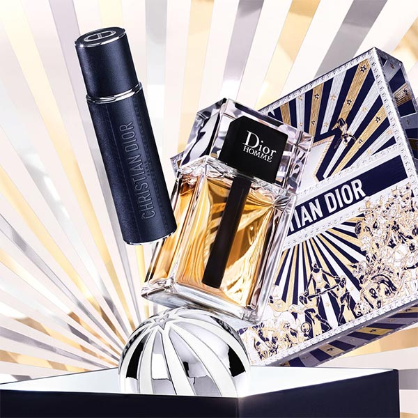 Dior Homme Eau de Toilette se presenta en un elegante estuche de edición limitada azul noche y dorado, adornado con un fresco con elegantes volutas vegetales y un sol radiante. Este cofre Dior Homme contiene: