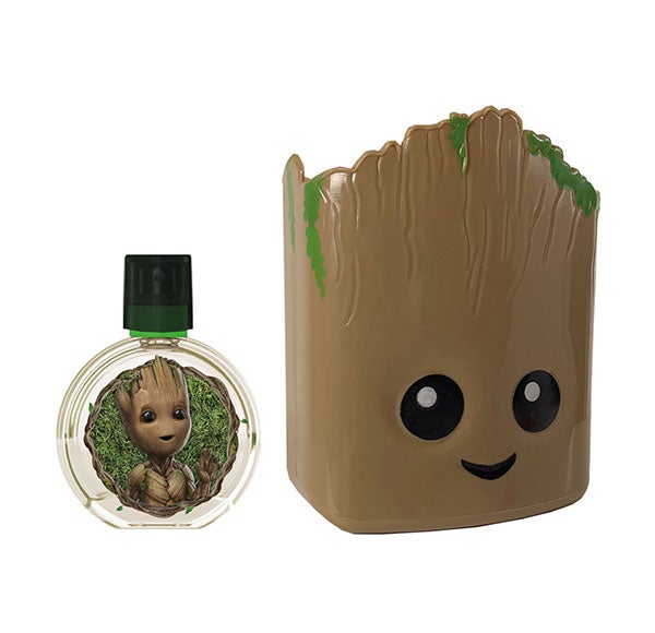 O estojo de Groot contém uma fragrância doce com notas de baunilha em formato 50 ml e um adorável porta-objetos para organizar e decorar sua mesa de estudo.