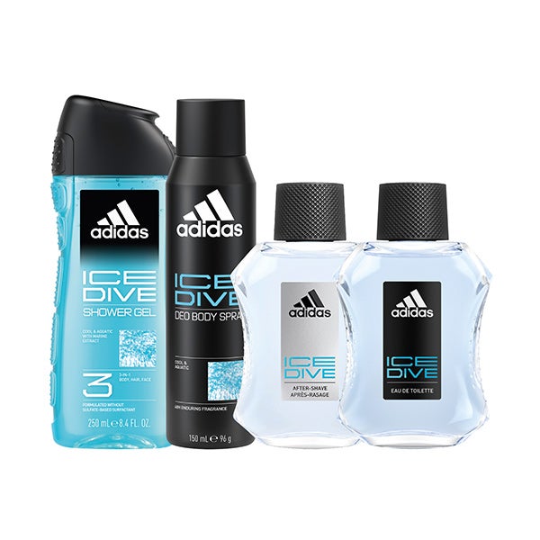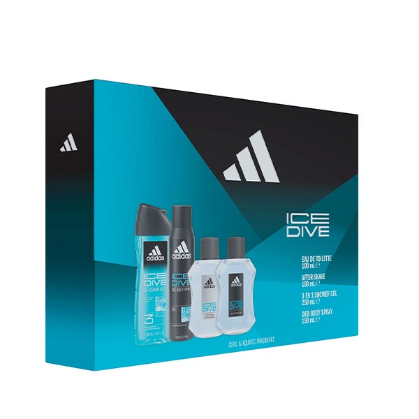 Conjunto Adidas Ice Dive para homem. Contém Eau de Toilette de 100ml, Body Spray Corporal de 150ml, Gel de Banho 250ml & After Shave 100ml.