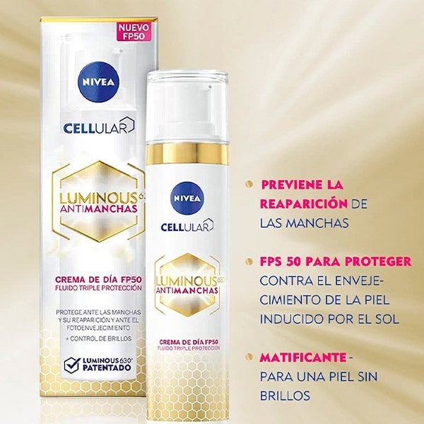 O creme de dia tem um alto fator de proteção solar (FP50) e filtros UVA/UVB, por isso reduz as manchas escuras existentes, evita que se intensifiquem e protege a pele frente ao fotoenvelhecimento induzido pela luz solar.