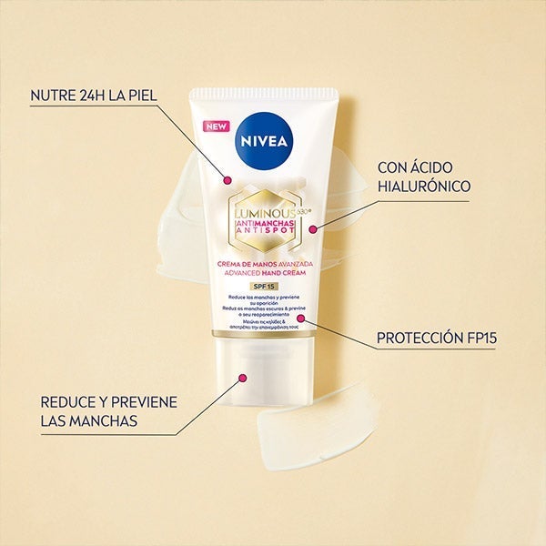 Sua fórmula enriquecida com ácido hialurônico nutre as mãos secas durante 24 horas e seu fator de proteção SPF15 ajuda a proteger a pele das mãos do escurecimento e do fotoenvelhecimento induzidos pelo sol.