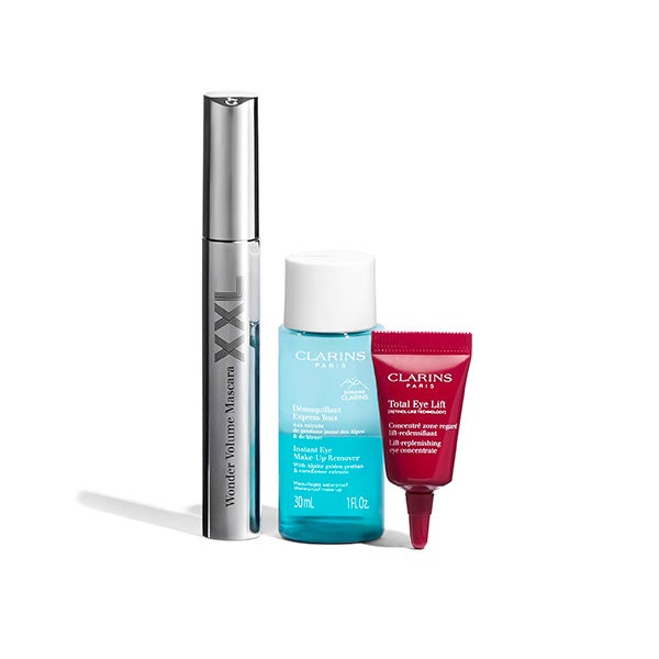 El Cofre Belleza Radiante de Clarins destaca por la Máscara Wonder Volume XXL, en tamaño de venta, que aporta volumen extremo, densifica y fortalece las pestañas desde la primera aplicación. Se complementa con el icónico Lip Comfort Oil, que hidrata y realza el brillo natural de los labios.