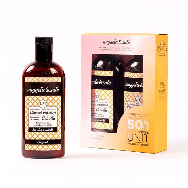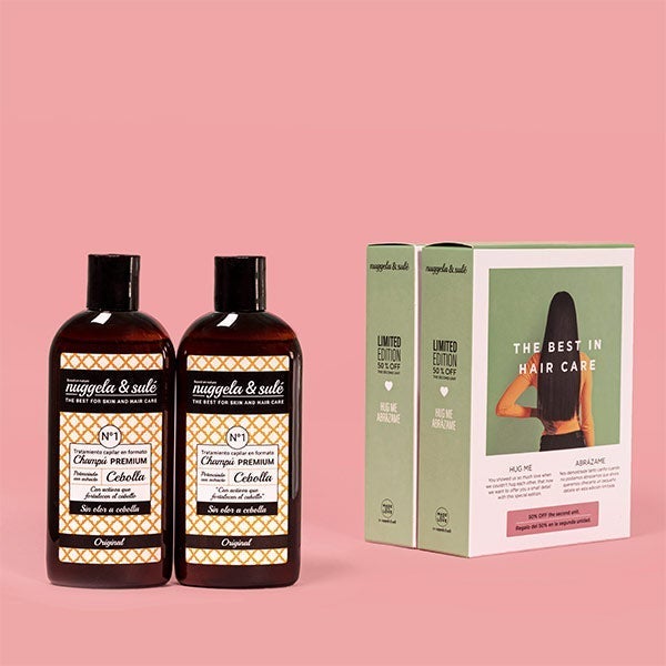 Estojo que contém duas unidades do icônico Shampoo Premium Nº1 de Nuggela & Sulé, um dos tratamentos capilares mais vendidos e revolucionários na Espanha.