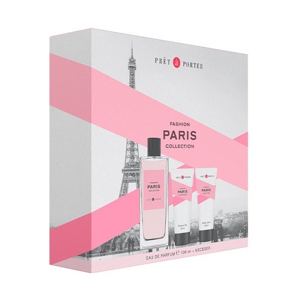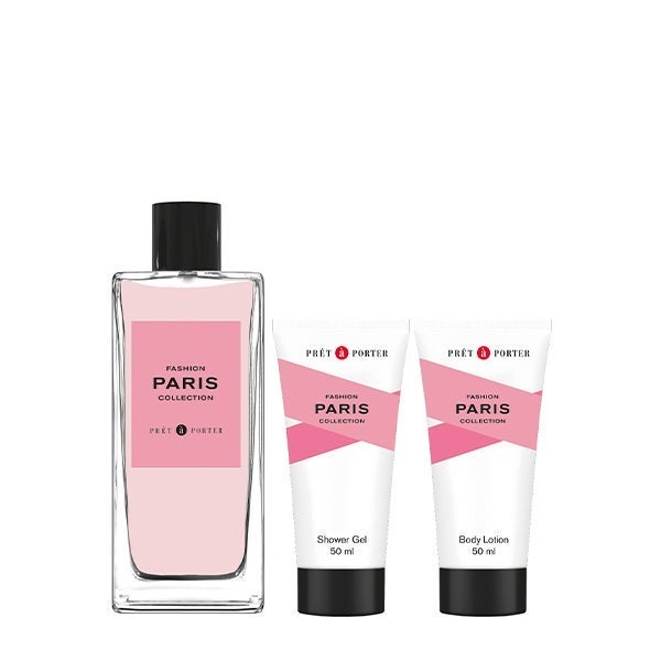 O conjunto de presente PARIS da coleção Fashion Collection de Prêt à Porter, inclui Eau de Parfum 100ml, junto com um Gel de banho e Body Lotion de 50ml. Esta Eau de Parfum para mulher é uma fragrância sedutora floral de rosas. Paris se abre com uma suculenta mistura de notas de groselha preta e tangerina com um toque picante de pimenta rosa. O coração revela um requintado acorde de macaron de Ispahan envolto em um buquê floral de rosa e jasmim. Por último, a fragrância se assenta em uma sofisticada assinatura de madeiras com quentes tons de almíscar e âmbar.