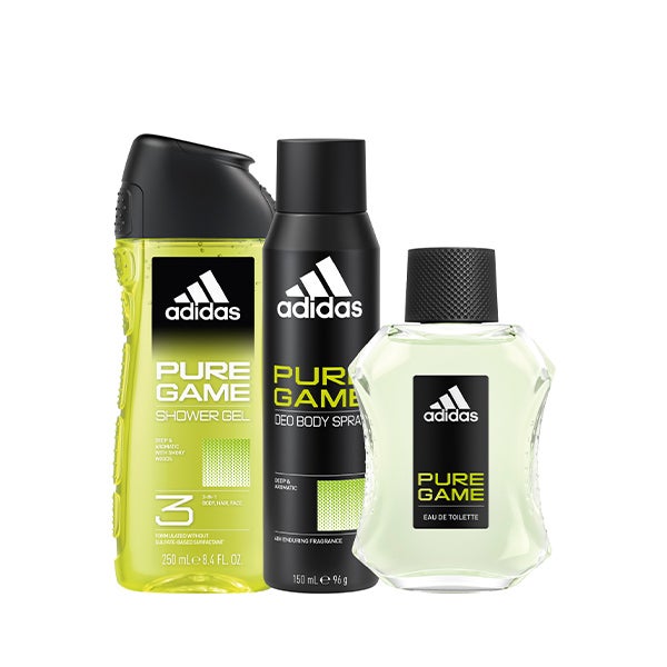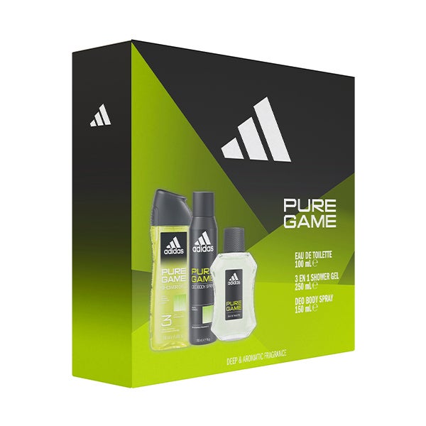 O estojo Adidas Pure Game é o aliado perfeito para os homens ativos e autênticos. Este conjunto inclui uma Eau de Toilette de 100 ml e um gel de banho 3 em 1 de 250 ml, ideal para rosto, corpo e cabelo. Uma combinação funcional, fresca e perfeita para a rotina diária.