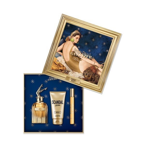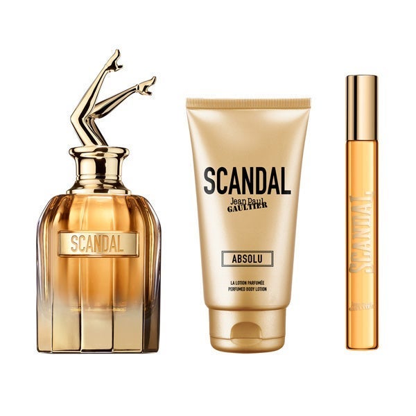 Este conjunto de presente contém um Scandal Absolu Parfum Concentré 80 ml, uma Loção Corporal 75 ml e um formato de viagem 10 ml.