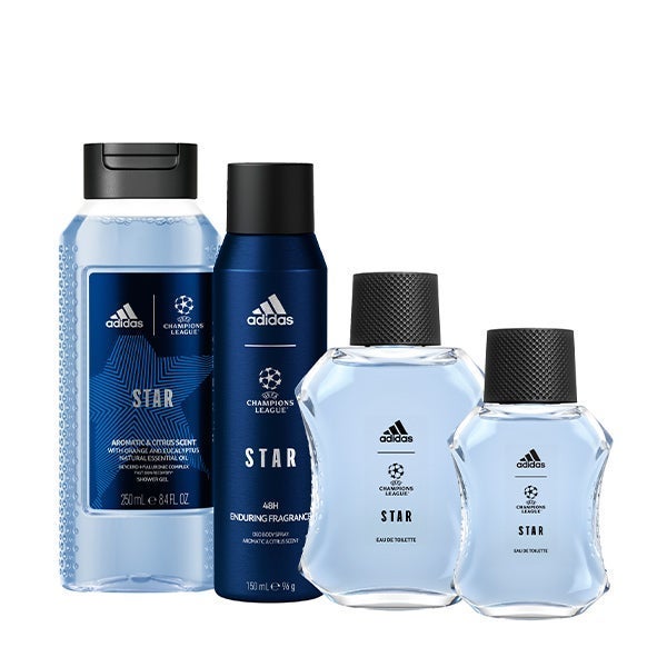 Adidas UEFA STAR é uma fragrância fresca de longa duração com notas de laranja, sálvia e pimenta preta. Com um aroma cítrico aromático e de longa duração que te proporciona frescor durante todo o dia. A fórmula vegana é feita com óleos essenciais naturais de laranja e sálvia. Além disso, junto com o gel de banho Uefa Star, você poderá liberar todo o seu potencial no seu dia a dia. É um gel de banho que proporciona um cuidado ótimo e uma sensação refrescante graças à sua fórmula também baseada em óleos essenciais de laranja e eucalipto. Um gel com essência fresca e duradoura, dedicado a todos os amantes do futebol.