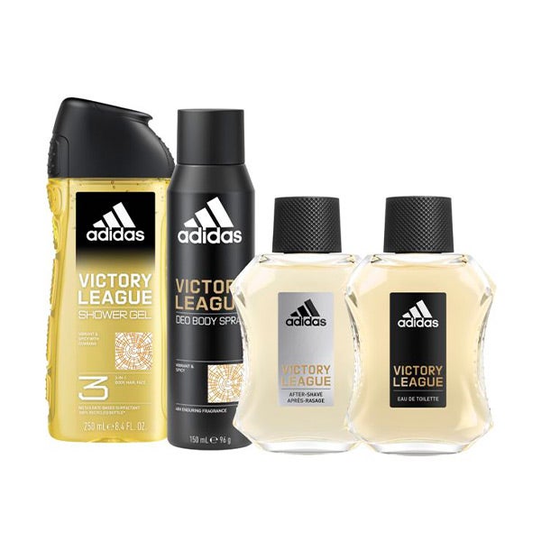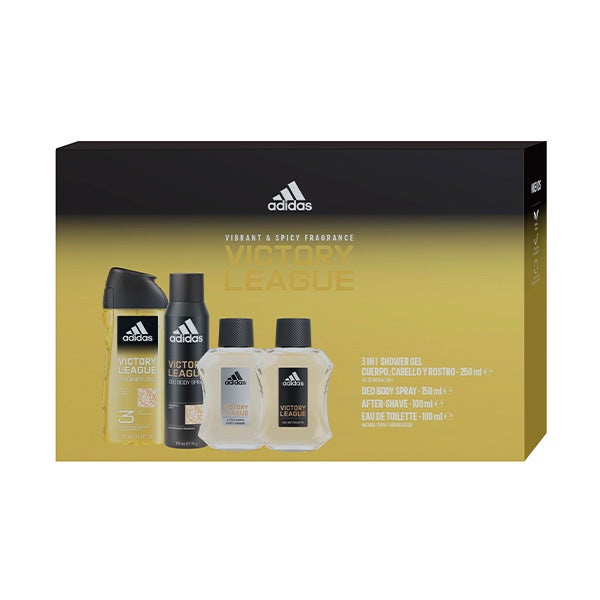 Conjunto ADIDAS Victory League para homem: O Eau de Toilette Adidas Victory League é uma fragrância vibrante e especiada que se inspira no poder da equipe e na força do indivíduo. A fragrância é composta por notas de limão, casca de fruta verde, notas amadeiradas e almíscar. O frasco do Eau de Toilette é fabricado com 25% de vidro reciclado e a tampa com 50% de plástico reciclado. Com óleo essencial natural de cardamomo e tangerina. Aroma de longa duração e fórmula vegana.