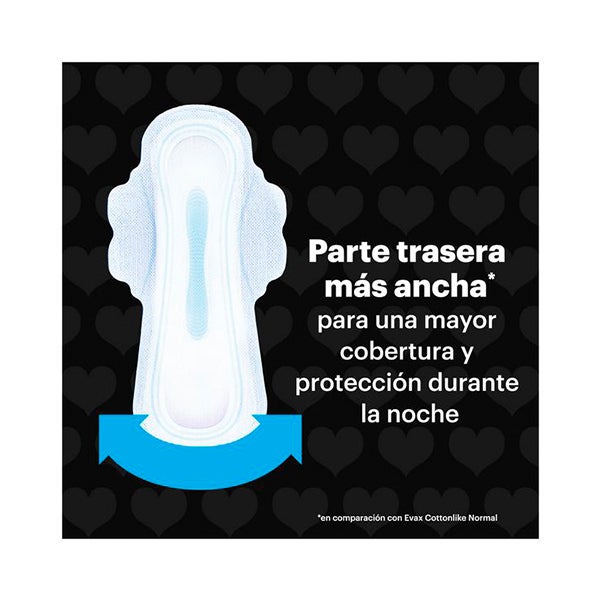 Os absorventes femininos Evax Cottonlike Noite estão desenhados para oferecer a proteção que você precisa durante a noite quando está menstruada e assim ajudar você a dormir melhor. São mais longos e mais largos na parte traseira para oferecer até 60% mais cobertura (vs. absorventes Evax Cottonlike Normal com Asas) onde mais precisa, seja qual for sua posição ao dormir. O Sistema Evax Cottonlike Dual incorpora pérolas ativas que neutralizam o odor e seu núcleo superabsorvente captura o fluxo menstrual instantaneamente. De longa duração, com asas para se manter no lugar e uma cobertura Cottonlike para maior suavidade, esses absorventes farão com que você se sinta confortável e permitirão que você durma a noite toda sem interrupções.