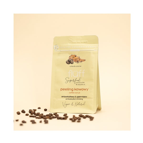 Fórmula de peeling seco anticelulítico e reafirmante com ingredientes 100% de origem natural: café robusta natural com açúcar mascavo, semente de morango, vitamina E, óleo de amêndoas doces e óleo de abacate.