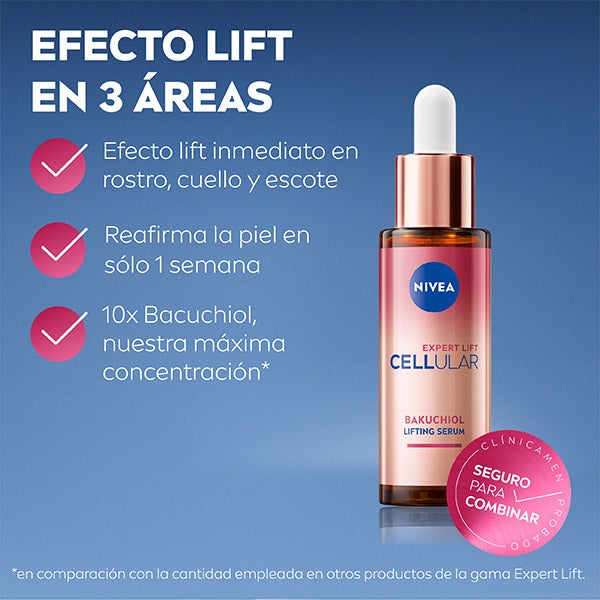 NIVEA Cellular Expert Lift Sérum Bakuchiol 3 Áreas é um sérum é uma solução eficaz que trabalha a nível celular em: