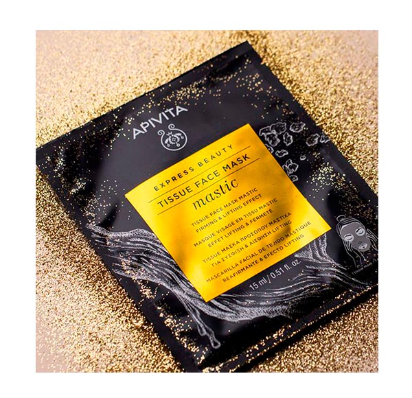 Uma máscara de tecido translúcido feita de biocelulose, impregnada com um soro superativo enriquecido com mástique, um lendário ingrediente nativo do Mediterrâneo que aumenta a elasticidade e a firmeza da pele. 100% biodegradável.