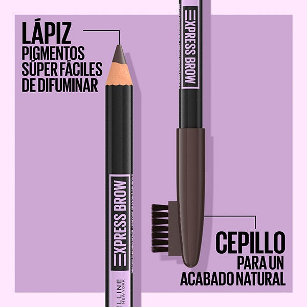 Rellena y define tus cejas de la forma más rápida, natural y sin necesidad de ser una experta con el nuevo lápiz de cejas de Maybelline Express Brow Shaping Pencil y su cepillo para difuminar y peinar.