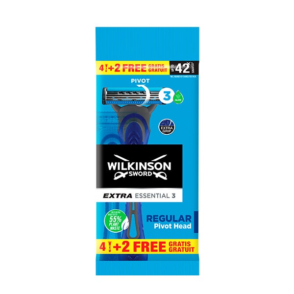 Máquina de barbear de 3 lâminas projetada para durar até 7 barbas em média. A máquina de barbear está equipada com uma cabeça ajustável que se adapta a cada contorno e uma tira lubrificante enriquecida com Jojoba.