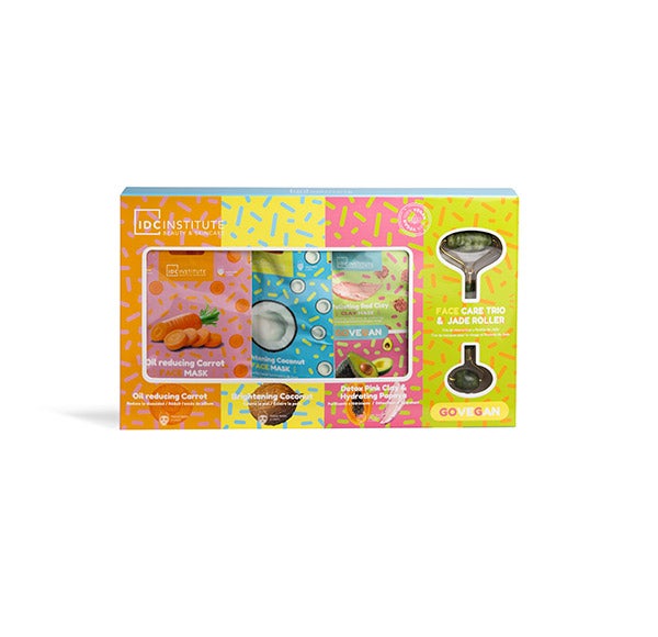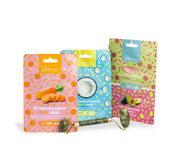 Este pacote de skincare contém 3 máscaras e um rolo de jade.