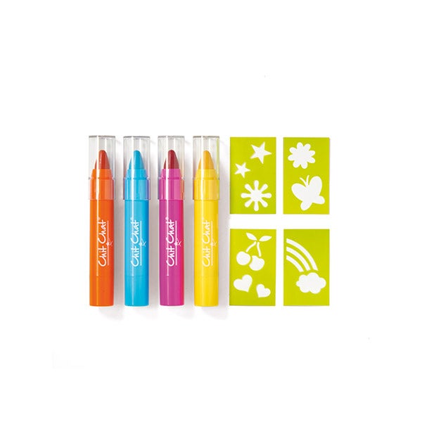 Maquiagem adequada para crianças. Pode ser usada no rosto e corpo e vem com moldes divertidos para desenhar os designs mais bonitos.