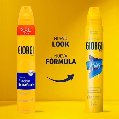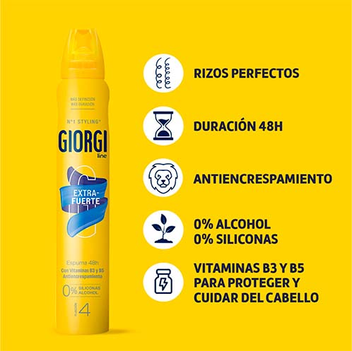 Prueba la Espuma Fijación Extrafuerte de Giorgi, ideal para conseguir un cabello con un acabado perfecto de larga duración durante 48 horas, sin encrespamiento y con máxima hidratación gracias a sus activos acondicionadores.