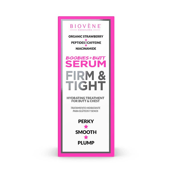 Tratamento de soro ultrahidratante para glúteos e seios com morango orgânico, peptídeos, cafeína e niacinamida para ajudar a manter uma aparência mais firme e lisa e proporcionar uma suavidade sensual com uma sensação de volume e vitalidade.