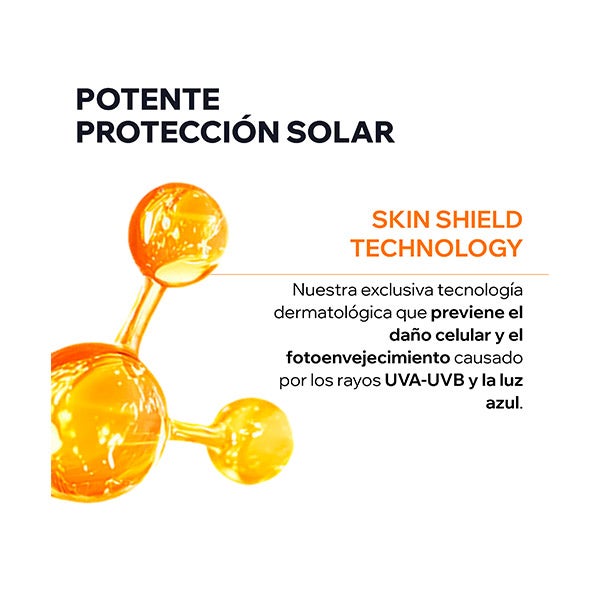 - Tecnologia Skin Shield: para uma proteção muito alta contra os raios UVB, UVA e a luz azul, para prevenir o dano celular e o fotoenvelhecimento.