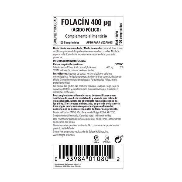 Folacín (ácido fólico) 400 µg da Solgar® fornece 400 microgramas de ácido fólico na forma de ácido pteroilglutâmico por comprimido.