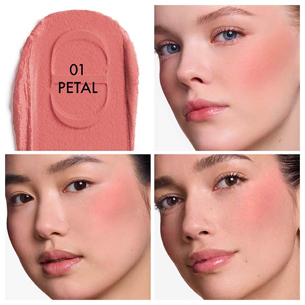 Aplicar o blush diretamente sobre a bochecha com a ponta dos dedos para um acabamento mais intenso ou utilizar o pincel Dior Backstage N°16 para um resultado mais difuso.