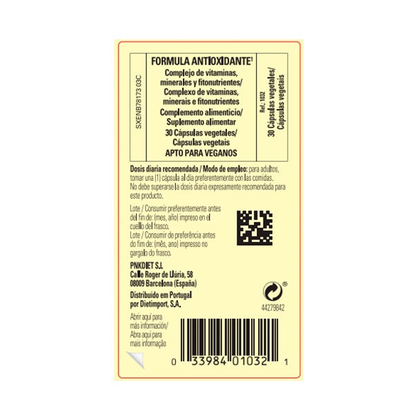 • Fórmula antioxidante • Combinação de diferentes vitaminas, minerais e fitonutrientes • Protege as células do dano oxidativo • Adequado para veganos e vegetarianos • Não contém sal A Vitamina C e o Zinco contribuem para a proteção das células contra o dano oxidativo.