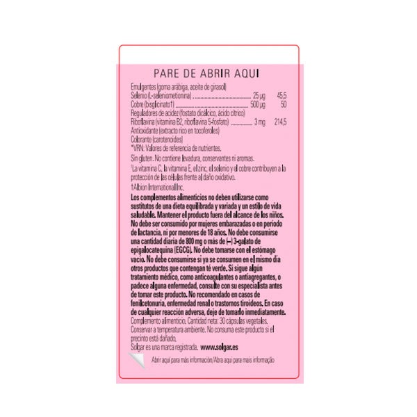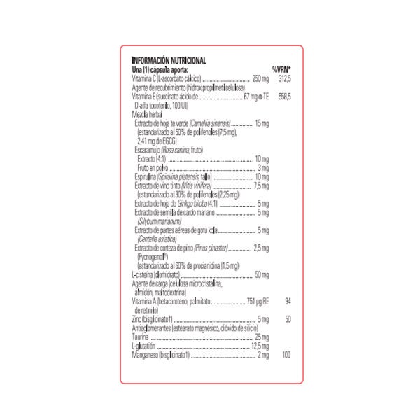Vitamina C (L-Ascorbato cálcico) 250 mg, Agente de recubrimiento (hidroxipropilmetilcelulosa), Vitamina E (succinato ácido de D-alfa tocoferilo, 100 UI) 67mg α-TE, Mezcla herbal: Extracto de hoja té verde (Camellia sinensis) estandarizado al 50% de polifenoles (7,5mg) 15mg, 2,41 mg de EGCGI Escaramujo (Rosa canina, fruto) Extracto (4:1) 10 mg, Fruto en polvo 3mg, Espirulina (Spirulina platensis, tallo) 10mg, Extracto de vino tinto (Vitis vinifera) 7,5mg, estandarizado al 30% de polifenoles (2,25mg), Extracto de hoja de de Ginkgo bilboa (4:1) 5mg, Extracto de semilla de cardo mariano (silybum marianum) 5mg, Extracto de partes aéreas de gotu kola (Centella asiática) 5mg, Extracto de corteza de pino (Pinus pinaster) (Pycnogenol) 2,5mg, Estandarizado al 60% de procianidina (1,5mg) L-cisteína (clorhidrato) 50g, Agente de carga (celulosa microcristalina, almidón, maltodextrina), Vitamina A (betacaroteno, palmitato de retinilo 751 µg RE, Zinc (bisglicinato) 5mg, Antiaglomerantes (estearato magnésico, dióxido de silicio) Taurina 25mg, L-glutation 12,5mg, Manganeso (bisglicinato) 2mg.