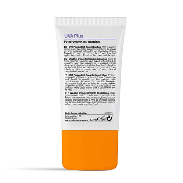 Fotoprotetor facial antimanchas SPF50+ com proteção UVA reforçada (UVA 38*), essencial para prevenir manchas causadas pela radiação solar.